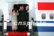 国家主席江泽民9日结束访问香港,江泽民主席与夫人王冶坪向送行人士挥手道别。中新社传真 卢峰 摄