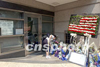 图:美国驻香港总领事馆门前献花人不断 2001年09月17日 17:40 ![]() 美国纽约世贸中心受攻击后,每天都有人到美国驻香港总领事馆献花悼念遇难者。9月17日美国驻香港总领事馆再度关闭,但依然不时有人在紧闭的大门外献上寄托哀思的鲜花。中新社传真 任晨鸣 摄 |