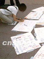 图:纽约华人以各种形式谴责恐怖主义 2001年09月19日 15:01 ![]() 纽约华埠孔子广场平整的红色地面上,近日贴着许多白色卡纸,上面用中英文写着谴责恐怖活动;悼念“九一一”死难者;祈求世界和平;以及支持重建世贸中心大厦的字句和诗篇。图为一位华裔女青年跪在地上写下自己的心愿。中新社图 龚文谟 摄 |