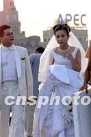 图:APEC开幕前夕上海掀起结婚潮 2001年10月13日 14:53 ![]() 一对年轻夫妇十三日在上海滨江路拍摄结婚照,背景的高楼上竖立着APEC标记。亚太经合组织高峰会开幕在即,上海迎来青年人的结婚高峰。中新社记者 毛建军 摄 |