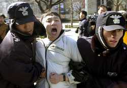 布什来访前韩民间团体警告美国不要强售战机(图) 2002年02月19日 15:00 ![]() 一名抗议布什访问的韩国学生被警察带走 中新网北京2月19日消息:美国总统布什今天即将抵达韩国首都汉城与金大中总统举行会谈,韩国军队和警察处于高度戒备状态。 韩国官员表示,一些民间和学生团体已经计划好在布什访问时举行集会和游行示威活动。 数个民间团体今天警告美国不要对韩国施压,在两国首脑会谈期间要求购买美国波音公司的F-15战斗机。 这六个民间团体发表联合声明说:“F-15战斗机正在被淘汰。政府不应该购买F-15这种即将停产的机型。”