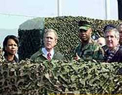 布什近距离"观察"朝鲜 地堡竖起防弹玻璃(图) 2002年02月20日 16:04 ![]() 布什所在的地堡内竖起了防弹玻璃 中新网北京2月20日消息:韩国总统金大中和来访的美国总统布什今天视察都罗山车站。 在一个观察哨所里,布什身穿一件手臂上绣有美国国旗的绿色军用夹克,通过双筒望远镜从垒着沙袋的地堡内观察朝鲜一侧。 路透社的报道说,在专门为他视察设置的防弹玻璃后面,布什望见了一座朝鲜的纪念馆。 安全人员在一侧竖起这块防弹玻璃,保护在地堡内的布什。他所在的位置距离非军事区分离南北两侧的中央线只有一百米。 从布什的位置望去,朝鲜一侧的哨所都清晰可见。在地堡上面停留十分钟后,布什和国务卿鲍威尔与美国士兵共进午餐。 他们与约二十名美军士兵一起品尝了冷盘、炸土豆片、水果和饼干。这些士兵二十小时都在这个哨所值勤。 在被问及他观望朝鲜一侧的感受时,布什回答说:“我们已经准备好了。”