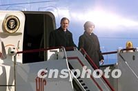 组图:美国总统布什抵达北京 2002年02月21日 11:10 ![]() 美国总统布什乘坐的“空军一号”二十一日上午降落在北京首都国际机场。中新社记者 毛建军 摄 ![]() 美国总统布什与夫人二十一日上午乘专机抵达北京首都国际机场,开始为期两天的工作访问。中新社图 毛建军 摄