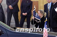 ![]() 美国总统布什与夫人二十一日上午抵达北京首都国际机场,开始为期两天的工作访问。中新社图 毛建军 摄 ![]() 美国白宫工作人员二十一日在北京首都国际机场为美国总统布什座驾安装旗帜。中新社记者 毛建军 摄