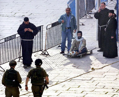 详讯:39名巴勒斯坦武装人员今天离开圣诞教堂 2002年05月10日 14:10 图为受腿伤的武装人员。法新图 中新网北京5月10日消息:伯利恒当地时间5月10日上午(北京时间5月10日中午),被困伯利恒圣诞教堂长达五周之久的39名巴勒斯坦武装人员今天被几辆公共汽车带走。根据欧盟调解的协议,其中13名以色列方面强烈通缉的武装人员将被一架英国军用飞机带往塞浦路斯,然后转往几个欧洲国家。另外26名武装人员将被带往加沙地区。 据以色列军方的一位发言人称,载有13名巴方武装人员的公共汽车已经抵达教堂附近的一个军事基地,其中一名武装人员将在那里接受腿伤治疗,然后他们将被带往特拉维夫附近的一个机场。 另据报道,英国一架军用飞机已经离开塞浦路斯基地,前往以色列引渡13名巴勒斯坦武装人员,这些武装人员曾在伯利恒的圣殿教堂与以色列军方对峙交火。 这架军用飞机的型号是绰号“大力神”的C-130型运输机,塞浦路斯官员表示,“有关方面通知我们这架飞机是前往以色列引渡巴勒斯坦人员的。” 塞浦路斯曾于本周四与欧盟官员进行过协商,并决定暂时收容这13名巴方武装人员。官员们预计这些武装人员将在塞浦路斯停留至下周一,然后由欧盟外长会议决定他们应当被引渡到何地。被引渡的13名武装人员中包括伯利恒的巴勒斯坦情报部门的首脑阿卜杜拉-道德(Abdullah Daoud)。 根据以巴双方达成的和解协议,在这13名巴方的武装人员被引渡到欧盟国家以后,另外26名巴方人员将被带到加沙地区,以方还将释放大约85名平民。(春风)
