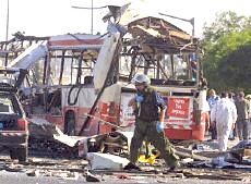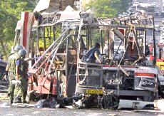 耶路撒冷市中心公共汽车爆炸案已有18人死亡(图) 2002年06月18日 15:29 ![]() ![]() 被袭击的公共汽车 中新网北京6月18日消息:以色列电视二台18日报道说,耶路撒冷市中心当日上午发生公共汽车自杀炸弹袭击事件,造成17人死亡。 报道没有说明死亡人数中是否包括自杀炸弹袭击者本人。这起自杀性炸弹袭击还造成车上32人受伤。 这辆公共汽车从耶路撒冷南郊的吉罗犹太人区开往市中心,当时正是交通高峰时段。 阿克萨烈士旅宣称对耶路撒冷公汽爆炸案负责 中新网北京6月18日消息:黎巴嫩真主党游击队的电视台18日接到匿名电话,此人声称“阿克萨烈士旅”对耶路撒冷爆炸案负责。 德新社援引该电视台的报道说,这次炸弹袭击是为了“阿克萨烈士旅”在伯利恒的领导人苏布赫17日被杀而进行的报复。 耶路撒冷南部18日交通高峰时段发生公共汽车爆炸案,造成13人死亡,40人受伤,其中5人情况危急。 哈马斯组织也声称对耶路撒冷公汽爆炸案负责 中新网北京6月18日消息:巴勒斯坦激进的“伊斯兰抵抗运动”(哈马斯组织)18日宣称对耶路撒冷公共汽车爆炸案负责。 有人给法新社打去匿名电话,声称哈马斯组织的军事派别“卡萨姆旅”实施了这次行动。 另据报道,黎巴嫩真主党游击队的电视台也接到匿名电话,此人声称“阿克萨烈士旅”对耶路撒冷爆炸案负责。 耶路撒冷市中心18日交通高峰时段发生公共汽车爆炸案,造成17人死亡,约30人受伤。 沙龙亲临耶路撒冷爆炸现场拒谈巴勒斯坦建国 中新网北京6月18日消息:在耶路撒冷市中心发生造成17人死亡的公汽爆炸案后,以色列总理沙龙18日拒绝巴勒斯坦建国。 据法新社报道,沙龙在事发现场对记者表示:“你还能谈什么巴勒斯坦国家。”这是沙龙出任总理以来首次亲往巴勒斯坦人自杀炸弹袭击现场视察。 沙龙在数十名警察和保镖的簇拥下表示:“我们今天见到的是巴勒斯坦恐怖主义,我们必须打击这种恐怖主义,这也正是我们在做的。” 美国官员最近提出建立临时的巴勒斯坦国家的构想,并通过谈判确定其最终的形式。 18日的自杀性炸弹袭击发生之际,美国总统布什正准备宣布其中东和平新战略。 耶路撒冷公汽爆炸案造成18名以色列人死亡 中新网北京6月18日消息:18日在耶路撒冷市中心,一名巴勒斯坦人在公共汽车上引爆炸弹,造成18名以色列人死亡,其中包括一些学童。 据法新社报道,医院官员透露说,48名伤者正在接受治疗,其中包括数名年龄在10到12岁之间的儿童。 报道还说,一名妇女在入院后不久就不治身亡,另外还有6名伤者的伤势严重。 相关报道:耶路撒冷南部发生公车爆炸 13人死亡40人受伤