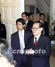 ![]() 六月三十日,香港特首董建华在香港特区政府礼宾府欢迎国家主席江泽民。潘索菲 摄