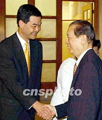 图:庆祝晚宴上钱其琛与梁振英握手 2002年06月30日 22:14 ![]() 六月三十日,国务院副总理钱其琛在香港出席特区政府成立五周年庆祝晚宴时与行政会议召集人梁振英握手。潘索菲 摄
