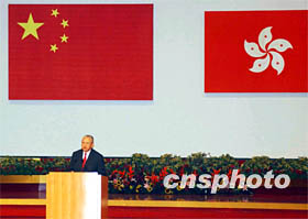 ![]() 7月1日上午,董建华宣誓就任香港特区第二届政府行政长官后发表致辞。中新社传真 任晨鸣 摄