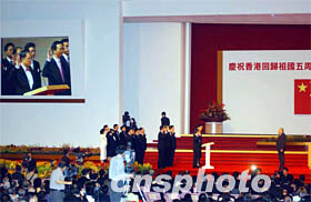 中新社香港七月一日电(记者张传熙黄少华)庆祝香港回归五周年大会暨第二届香港特区政府就职典礼今天上午在香港会展中心新翼大会堂举行。香港特别行政区第二任行政长官董建华和第二届特区政府十九名主要官员在庄严的仪式上宣誓就职。 世界的目光今早再度投向美丽的香港。座落在维多利亚港畔的香港会展中心新翼大会堂今早灯光璀璨,嘉宾如潮。红色成了就职典礼的主色调:呈梯形状的主席台上铺着红色地毯,政府官员沿着红色台阶,鱼贯登台宣誓。 这标志着香港特区首届政府已顺利完成历史使命,继任的新一届政府已全部到位并开始运作。 出席仪式的国家主席江泽民代表中央政府和全国各族人们,向新就任的特区第二任行政长官董建华和第二届政府主要官员、行政会议成员表示祝贺。江泽民还在会上发表讲话,希望特区政府与各界人士与时并进,积极进取,努力创造香港更加美好的未来。 上午,鲜花、绿树装点的香港会展中心新翼五楼大礼堂一片喜庆。会场正中的主席台上方,悬挂着国旗和香港特区区旗。江泽民主席在行政长官董建华的陪同下步入大会堂时,全场二千名嘉宾起立鼓掌,向江泽民的到来表示热烈欢迎。 八时五十九分,就职典礼在雄壮的国歌声中拉开帷幕。最先走上主席台宣誓就职的是行政长官董建华。国家主席江泽民监誓。董建华庄严地举起右手,宣誓:“本人就任中华人民共和国香港特别行政区行政长官,定当拥护中华人民共和国香港特别行政区基本法,效忠中华人民共和国香港特别行政区,尽忠职守,遵守法律,廉洁奉公,为香港特别行政区服务,对中华人民共和国中央人民政府和香港特别行政区负责”。 宣誓毕,江泽民主席和董建华紧紧握手,全场掌声如潮。 五年前的今天,董建华第一次宣誓就任首届特区行政长官。从那时起,香港的历史改写了,香港回到了祖国的怀抱,开始了港人治港的新里程。今天董建华再次宣誓就职,不同的是,他标志着新一届特区政府将承前启后管治香港,对香港的未来将会有更多的承担。 接着,江泽民监誓下宣誓就职的还有由董建华提名、中央政府任命的第二届特区政府十九名主要官员,包括三司十一局以及警务处、入境处、海关、廉政公署以及审计处官员。而改组后的行政会议十九名成员也在董建华的监誓下,由政务司司长曾荫权带领宣誓就职。 第二届行政长官董建华在宣誓礼毕后发表讲话。他说,在我即将履行第二任行政长官职责的时候,我意识到所面对的形势是严峻的,担任的责任是重大的。他说,带领香港经济走出困境,恢复市民对前景的信心,是本届政府面对的挑战。 他表示,政府将竭尽所能,充分利用内地经济发展的机会,开拓香港的发展空间,香港将会加快和广东省的全面合作。他表示相信,过去五年的调整和适应,虽然历尽艰辛,但却又为香港将来的兴旺奠定了基础。他相信香港在各界的精诚团结努力下,一定能够走出困境。 江泽民主席在会上发表讲话,充分肯定了香港过去五年所取得的成就。江泽民指出,香港回归祖国以来的五年,是“一国两制”由科学构想变为生动现实的五年,也是董建华先生领导的特区政府团结各界人士不断克服困难、奋力前进的五年。他说今天的香港,“一国两制”、“港人治港”、高度自治方针得到全面落实,原有的资本主义制度保持不变,广大居民继续以自己习惯的方式生活。香港仍然保持着自由港的特色和国际贸易、金融、航运中心的地位,继续被公认为亚洲乃至全球最具活力的地区之一。 江泽民说,事实充分证明,“一国两制”是完全行得通的,董建华先生及其领导的特区政府是具有驾驭复杂局势的能力的,香港人是完全能够治理好香港的。他说,五年来我们所获得的经验和体会,归结起来,就是在任何情况下都必须全面正确地贯彻“一国两制”的方针和香港基本法,全力支持行政长官和特区政府依法施政。 江泽民说,现在世界多极化和经济全球化趋势深入发展,科技进步日新月异,综合国力竞争日趋激烈,国际局势正在发生深刻的变化。他说,中国正在实施现代化建设的第三步战略目标,今后五到十年,也是香港经济和社会发展的关键时期。 江泽民在讲话中,还提出三点希望:希望香港各界更好地适应香港回归后的发展形势,当好香港和伟大祖国的主人;希望特区行政、立法、司法机关不断提高施政和执法水平,进一步落实行政主导体制,更好地为香港社会服务;希望各界人士坚定信心,自强不息,努力开创香港经济发展的新局面。 江泽民还强调,中央政府将继续支持和帮助香港恢复和发展经济。 简朴隆重的就职宣誓仪式在九时四十五分结束。仪式结束后,内地与香港的艺术家和表演团体表演了精彩的文艺节目,表达了全国人民对香港回归五周年的喜悦与欢庆。