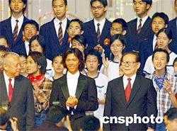 图:江泽民登台感谢全体演出人员 2002年07月01日 11:36 ![]() 7月1日上午,香港隆重举行庆祝香港回归祖国五周年大会暨特区第二届政府就职典礼,国家主席江泽民登台感谢全体演出人员。中新社传真任晨鸣摄
