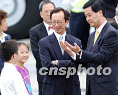 图:梁振英、梁锦松向学童问好 2002年07月01日 18:16 ![]() 香港行政会议召集人梁振英(右)、财政司长梁锦松等香港高官,7月1日在香港国际机场为国家主席江泽民送行前,与为江主席献花的学童问好。中新社图 洪少葵 摄