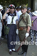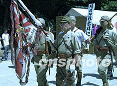 ![]() 十五日是日本战败五十七周年纪念日,在供奉有二战战犯的的靖国神社前,一群穿着原“鬼子兵”军服的人趾高气扬地来回游走。陶光雄 摄