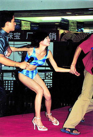 图文:女模特脱衣推销 男朋友愤而搅场 2002年08月19日 10:30 ![]() ■长衫就是“防腐层”■短裙代表“塑料”■脱得只剩内衣 ![]() ■男友硬拉模特离场 摄影/赵训成 中新网北京8月19日消息:读者赵先生昨天给北京青年报打来热线说,他前天在一个购物广场看到一个管道厂家为了让人们更了解“管道”的内部结构,竟然让两位假扮“管道”的小姐一层一层脱道具服,直到小姐的男友出面干涉才罢休。 赵先生讲述了事件的整个过程:“当时,我在商场购物,看见一家管道企业正在推介产品。两位扮演‘管道’的女模特当着众人的面脱起衣服,这让不少观众大吃一惊,还有一些母亲赶紧捂上孩子的眼睛。这两位女模特直到露出了穿在里面的内衣才停止。忽然,一位女模特的男友出现,硬拉女模特要离开,但厂家人员就是不让,双方开始争执,场面顿时变得异常混乱。” 有关广告专家分析说,让消费者反感的广告形式有可能抬高了企业的“知名度”,但是却降低了产品的“美誉度”,反而会给产品销售带来负面效果。毕竟,消费者是否选择这种产品,最终还是决定于产品质量和售后服务,这样的“秀”还是少做为好。(王旭)