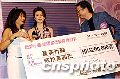 为改变中国病童的世界,好让他们重现笑容,香港乐思富公司8月31日在时代广场捐赠价值20万港元产品支持 “微笑行动”慈善机构。图为乐思富公司总经理罗宜敏【右】将支票颁给“微笑行动”代表接收。洪少葵 摄
