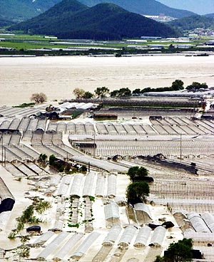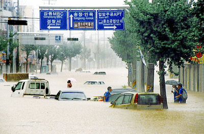 总统金大中周日召开内阁紧急会议,下令政府部门和军方尽量派出人员参与救灾和善后工作。灾情较重的有江陵及附近地区,十三人在山泥倾泻中失踪,十部车子遭山泥掩埋,街上水深至行人的腰部,一万九千人无家可归。