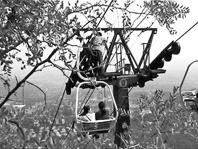 据了解,昨天中午12时20分左右,为香山公园布置监控系统的北京机械科学研究院监控工作室在布线过程中,因为施工用的钢缆卡住一辆缆车,造成缆车上一名游客跌落下来受伤,另一名游客吊在空中时被工作人员及时救下。事故发生在11到12支架之间,一度引起整个索道停运。记者在现场看到,事故发生处的索道钢缆缠成一团乱麻,有工程人员站在钢缆上将缠住的线剪断。