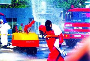很快,消防队员确定出染毒区和警戒区,警戒哨兵立即站到岗上,阻止车辆、人员进入染毒区域,防止二次染毒。不同类型的洗消帐篷被迅速充气建起,中毒人员被送入其中进行洗消、救治。大水罐车喷射雾状水流和水幕,稀释降毒,防止毒气向安全区扩散,掩护现场救援。