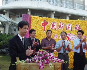 中新社总编辑郭招金在庆典上致辞。他说,中新社是中国两家通讯社之一,成立于一九五二年九月十四日,主要为港澳同胞、台湾同胞、华人华侨服务。目前,中新社在中国内地的二十五个省、自治区、直辖市设有五十六个分社、支社、记者站。在香港、澳门特别行政区,在美国、澳大利亚、日本、法国、泰国建有分支机构。现在中新社每天播发新闻电讯稿一百余条,传真图片三十多张,中国新闻网每天更新新闻四五百条,中国新闻图片网每天更新新闻图片一百多幅,向海外几十家报纸提供专稿和制作十七个报纸版面。