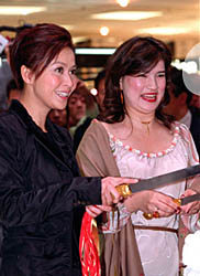 浪琴表亚洲形象大使刘嘉玲、浪琴表中国及香港地区总裁麦姬丽(右)十九日在北京当代商城为“浪琴”一百七十周年庆典巡展揭幕。作者:郑萍萍