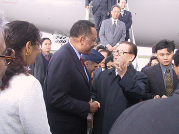 当江泽民抵达下榻的饭店时,美国前总统布什在饭店门口迎接,与江主席热情握手,互致问候。美国驻华大使雷德专程陪同江主席同机抵达休斯敦。