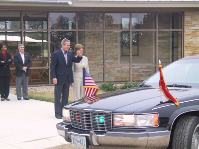 当江泽民和夫人王冶坪乘专车抵达牧场正门口时,提早迎候在那里的布什总统和夫人劳拉走向前去,与江泽民夫妇热情握手。布什说,这个牧场是我温暖的家,我和劳拉非常高兴在家里接待你和王冶坪女士。