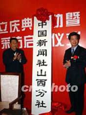 中国新闻社副社长兼总编辑郭招金和山西省政协主席郑社奎,在欢乐的乐曲和来宾的掌声当中,为中新社山西分社揭牌。中华全国新闻工作者协会有关负责人,以及“华夏文明看山西”港澳台记者团也参加了此间活动。