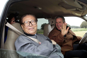 江主席这次访美举世瞩目。一年前,江主席和布什总统在上海出席亚太经济合作组织第九次领导人非正式会议期间举行首次会晤,双方决定共同努力发展中美建设性合作关系。今年2月,布什总统访华,两国元首在北京就充实两国建设性合作关系达成共识。这次江主席访美,布什总统特意安排在克劳福德自己的牧场接待江主席,体现了两国领导人之间的密切关系和对发展两国关系的高度重视。两国元首举行会谈,就发展中美建设性合作关系和重大国际及地区问题深入交换了看法,达成了一系列重要共识,再次强调了中美平等友好合作对两国和世界的重要性。双方决定加强两国高层战略对话和交往,在双向互利的基础上加强反恐交流与合作,加强在经济贸易方面的合作,恢复两军交往和副外长级战略安全、军控和防扩散等磋商。江主席阐明了“和平统一、一国两制”的基本方针,强调了“台独”活动对和平解决台湾问题的严重危害性,要求美方恪守一个中国政策和中美三个联合公报,为中国完成祖国统一发挥建设性作用。美方重申坚持一个中国政策、遵守中美三个联合公报的原则,反对台湾独立。对中美之间存在的一些分歧,江主席强调应本着相互尊重的精神,通过对话增进了解、扩大共识。