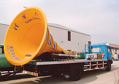 它是高技术的产品--气动喇叭。中国的这种气动喇叭是世界水平最高的。它能让12公里外的听众清楚地听到广播,它巨大的功率使它播音时根本没有人敢站在喇叭前。它是作为世界唯一的机场消雾喇叭的身份来参加航展的。据介绍它只要吼叫起来,甚至机场跑道上的雾都会消散。