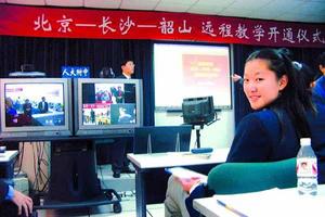 中新网11月7日电 昨天下午,“北京—长沙—韶山远程教学直通车”正式开通。北京人大附中、湖南长沙一中和韶山学校高二的几十名同学在各自的远程教室上了一堂别开生面的课。这是我国首次实现跨省区实时交互式的远程教学。