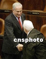 11月6日,内塔尼亚胡正式就任沙龙重新组阁后的以色列新内阁外长。图为内塔尼亚胡在宣誓就职后,与总理沙龙握手致意。Ic/cnsphoto 摄