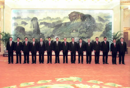 中新社北京十一月十五日电 中国国家主席、中央军委主席江泽民和十五届中央政治局其他常委李鹏、朱镕基、李瑞环、尉健行、李岚清,新当选的中共中央总书记胡锦涛和十六届中央政治局其他常委吴邦国、温家宝、贾庆林、曾庆红、黄菊、吴官正、李长春、罗干,今天下午在人民大会堂会见了出席十六大的全体代表,并同大家合影留念。
