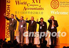 十一月十八日,香港举行规模盛大的世界会计师大会欢迎酒会,图为香港特别行政区行政长官董建华(中)出席该酒会。潘索菲 摄
