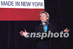 纽约州联邦参议员希拉里十一月二十二日在曼哈顿参加“我爱纽约时装”活动以示支持,她说自己身上穿着的衣服就是纽约制造的。作者:赵海燕
