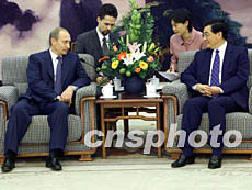 胡锦涛首先对普京的来访表示热烈欢迎。他说,值中国共产党十六大召开不久在北京与总统阁下再次见面感到非常高兴。去年十月,他应邀访问俄罗斯,总统阁下关于国际形势等问题的见解给他留下很深印象。那次访问时间虽短,但情形仍“历历在目、记忆犹新”。