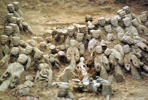 在长9.7米、宽1.9米的陪葬坑内,展现在世人眼前的是距今二千多年前的汉代王侯贵族车马出行时的豪华阵容,只见最前一排是五匹陶制的高头大马,马身上都骑着神态各异、栩栩如生的陶俑。