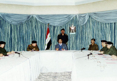 12月7日,伊拉克总统萨达姆(中)在巴格达主持内阁会议。萨达姆就伊拉克1990——1991年间占领科威特一事向科威特人民表示道歉的讲话。这是萨达姆首次就入侵科威特表示道歉。