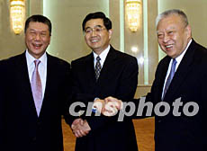 中新社北京十二月十一日电(记者 黄少华)国家副主席胡锦涛今天下午在人民大会堂福建厅会见了香港特别行政区行政长官董建华和澳门特别行政区行政长官何厚铧。