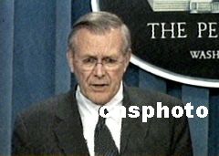 十七日,美国总统布什宣布,他已经下令军方着手部署导弹防御系统,以预防大规模杀伤性武器造成的“灾难性破坏”。国防部官员称,布什政府计划到2004年在阿拉斯加州格里利堡部署首批10枚陆基拦截导弹。图为美国防部长拉姆斯菲尔德介绍这个导弹防御系统。中新社 摄