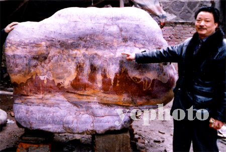李发军见石头上有青紫、紫红、灰黑、乳白、米黄等5种色彩,石面中下部有一带紫红色山峰,峰下是一带米黄色水浪,上部是远山和浮云,整个画面酷似一幅长江三峡夔门风雨群峰图。