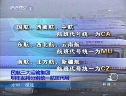 据中央电视台报道,2003年1月1日起,重组后的国航、东航、南航三大民航运输集团的航班代号将分别统一为CA、MU和CZ,同时西南航、中航、西北航、云南航、北方航、新疆航原有代号将不再使用。统一航班代号后,三大航空集团的飞机也将分别统一标志和名称,常旅客计划也将实现内部统一,扩展了常旅客会员累积里程和兑换奖励的航班范围。同时三大运输集团还将分别统一航空餐食标准。为了保证航班运行正常和平稳过渡,三大集团近期不会对航班计划和航线布局做大的调整。