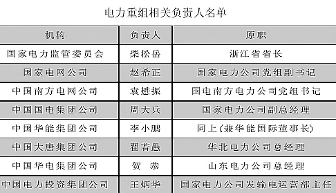 新成立的电力公司包括:国家电网公司和中国南方电网有限公司,以及中国华能集团公司、中国大唐集团公司、中国华电集团公司、中国国电集团公司、中国电力投资集团公司等五家发电公司,和公司中国电力工程顾问集团公司、中国水电工程顾问集团公司、中国水利水电建设集团公司和中国葛洲坝集团公司等四家辅业公司。