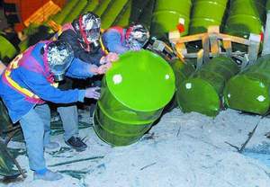 一名值勤的警官介绍,甲基吡啶为一种剧毒的化学物品,一旦发生泄漏,闻到这种气味不久便会出现头昏等症状,所以进入现场的抢险人员都要戴罩甚至防毒面具。
