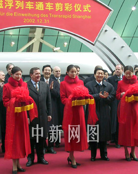 中新网12月31日电 世界第一条磁浮商业示范线——上海磁浮列车线今天上午试运行通车,国务院总理朱镕基和正在中国访问的德国总理施罗德亲临现场,为上海磁浮列车示范运营线试运行通车剪彩,并一同乘坐了首发的磁浮列车。