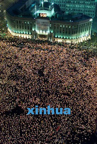 新华社消息,当天晚上,5000多名汉城市民聚集在市中心区光化门前的街道上,手持蜡烛,悼念死去的两名女中学生,并要求全面修改《驻韩美军地位协定》,防止在新的一年里再次发生类似事件。与此同时,韩国大批警察在驻韩美国大使馆前筑起人墙,阻止示威者接近。