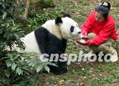 闻悉今天是为大熊猫贺岁的日子,一大早就有机构、个人纷纷来到熊猫世界,向闻名海内外的大熊猫名星“青青”和“巴斯”送来了各种别出心裁的礼物。熊猫世界被数百盆由郊区花农送来的名贵花卉盆景蝴蝶兰、君子兰、富贵竹及各种娇艳鲜花簇拥,其中一座由七层蛋糕叠成的“宝塔”和一块方形大蛋糕尤为引人注目。这个方形大蛋糕是福州向阳食品有限公司专门为“青青”和“巴斯”贺岁而制作的,长一点二米,宽六十公分,蛋糕四周用黄色果脯片装点成框,用绿色糖油浇成一株株竖立的箭竹,用巧克力浇制一株株椰树,蛋糕中间,还雕有八只正在嬉戏的可爱大熊猫,令围观群众大饱眼福。