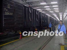 一月七日粤海铁路火车轮渡将正式开通,今天在最后的试运行中,铁道部领导亲自见证了火车开进粤海铁巨大的船舱。关向东 摄