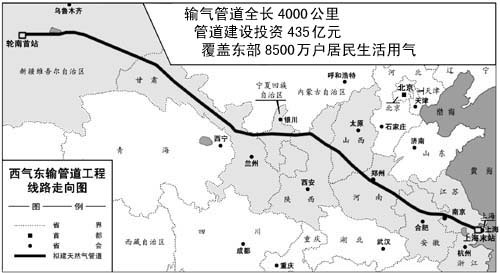 作为中国最长的管道工程和实施西部大开发战略的标志性项目,西气东输管道工程于2002年7月4日开工。该管线的建成将使中国的天然气产量增加50%,使天然气占全国一次能源结构的比重由2.1%提高到3%。