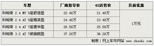 据雪佛兰4S店销售人员介绍:目前2.4升排量车型现车较为充足,颜色较齐全,白色、银色现车很多,但无红色车型,如预定需要等待1-2周时间。3.2车型依旧无现车,订车需等一个月时间。科帕奇全系目前可优惠1万元现金,不送任何装饰。