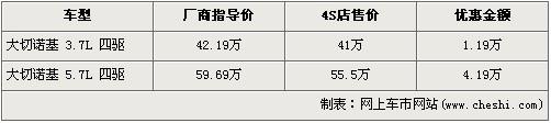 吉普大切诺基是吉普家族中极具个性的一款大尺寸车型,在推出3.7L排量车型后,消费者的选择空间更大,同时带给驾乘者完全不同的驾驶体验。根据网上车市价格监测系统显示,目前大切诺基全系最高优惠4.19万元,具体车型以及价格如下: